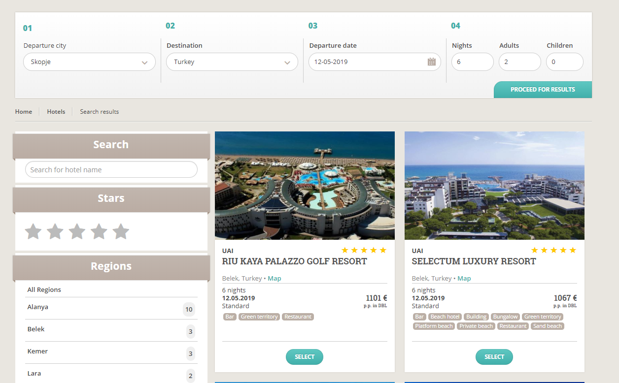 In this page are shown all hotels based on the request that you made before.In the same window the parameters can be changed, hotels can be filtered by hotel name, stars and region.