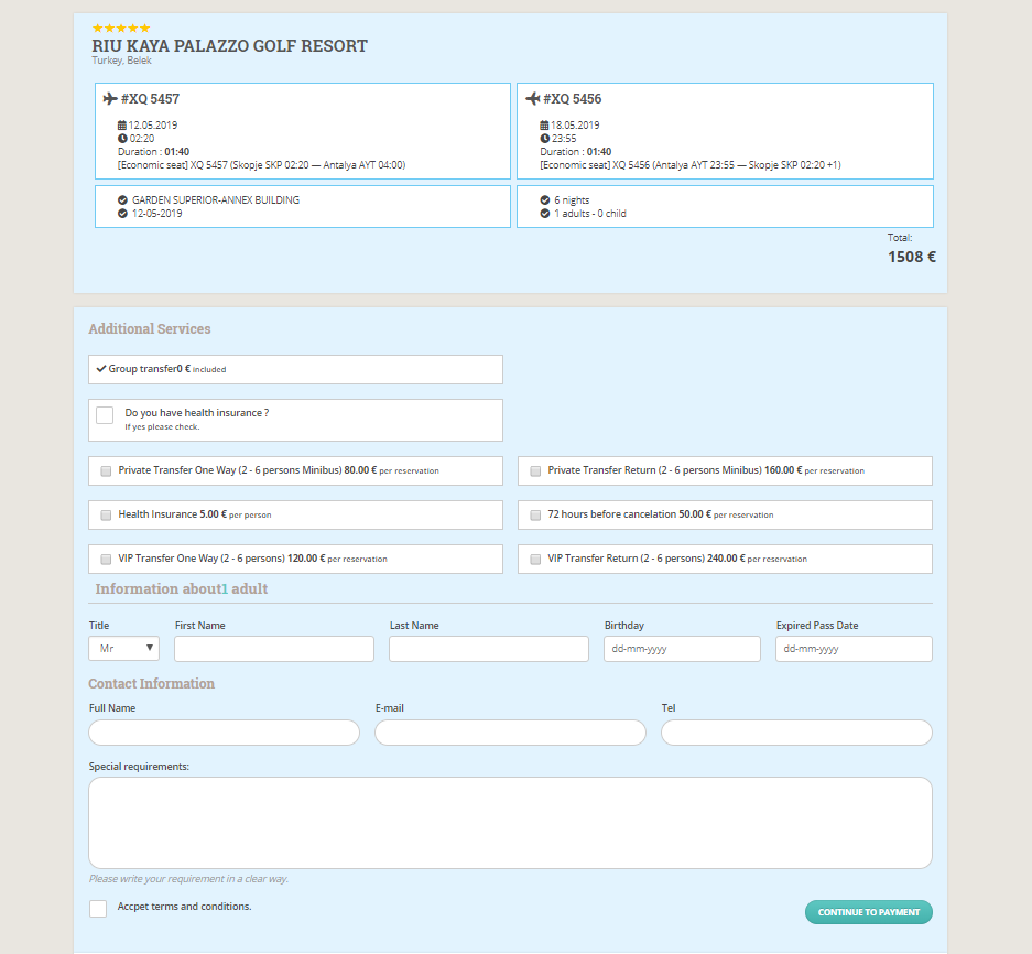 After you have select the acomodation room, you have to fill information about the passengers, contact information, and select some additional services(if you want).In the end of the form, there should be accepeted the rules and conditions after you have read them. Continue to payment
