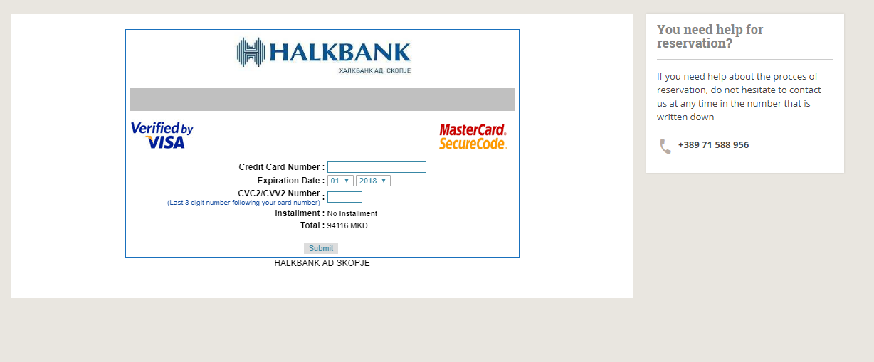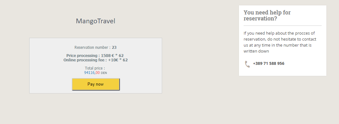 After you have filled all your inforamtion, a window for payment will be displayed. Final Price, converted in Macedonian Denar, reservation number, and some other information are information that will be processed next. Pay now is the button to continue with the payment process.